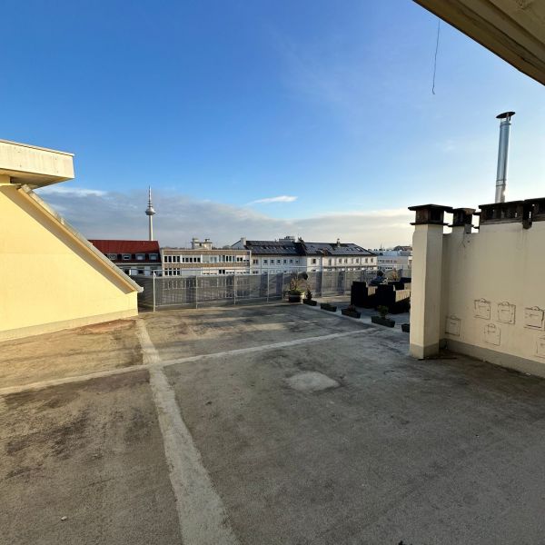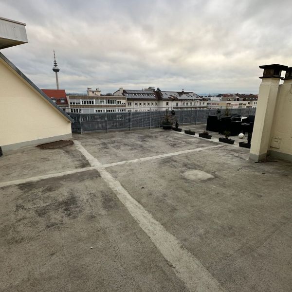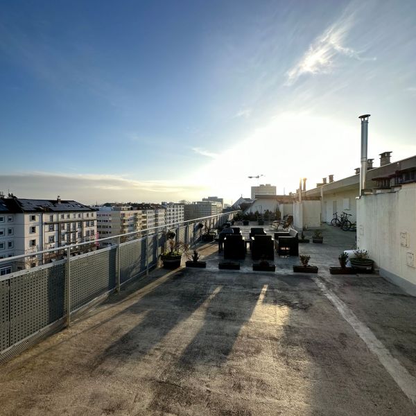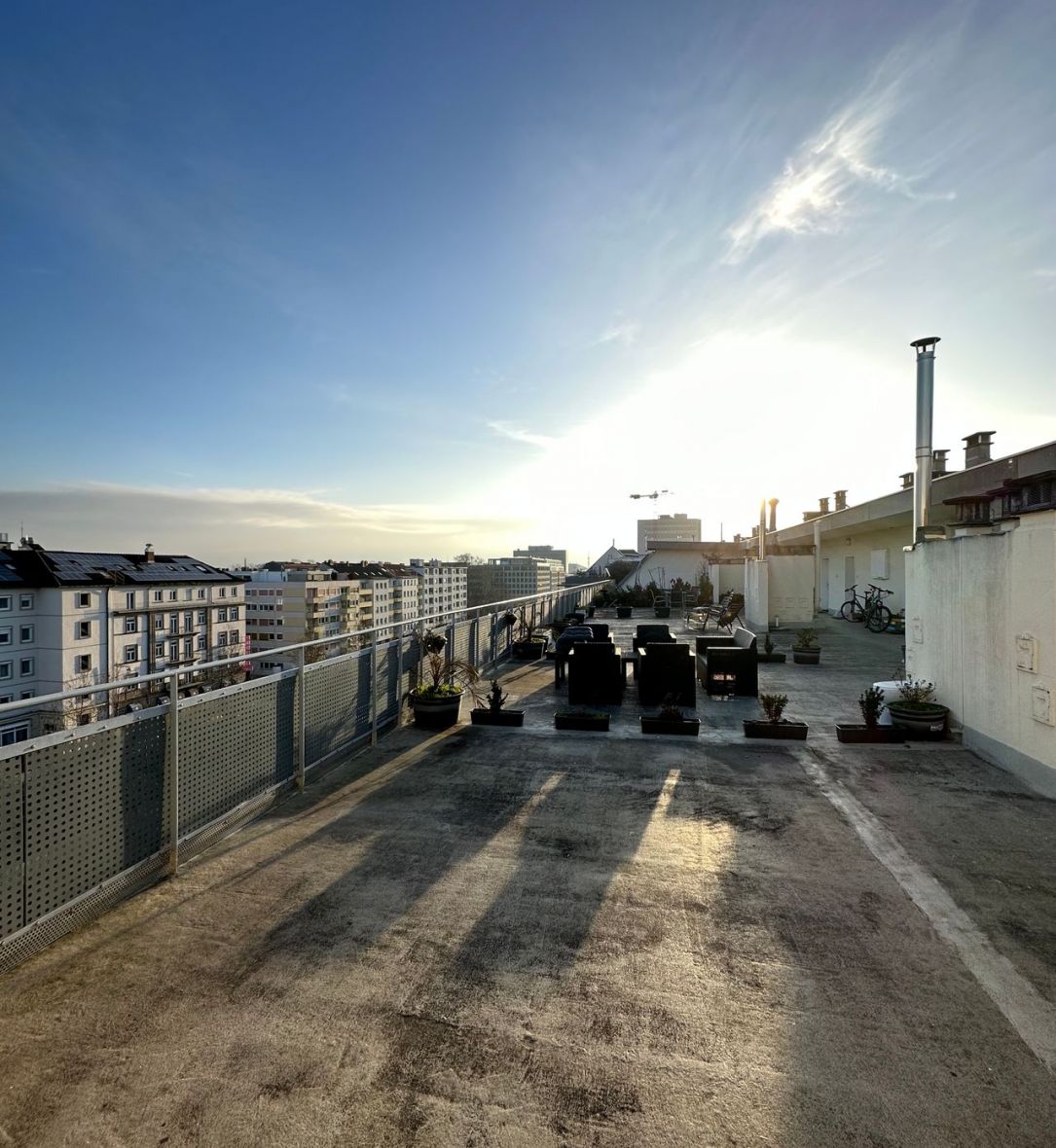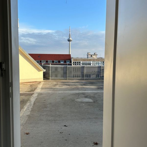 Eine große Dachterasse bietet einen einzigartigen Blick bis in den Odenwald.